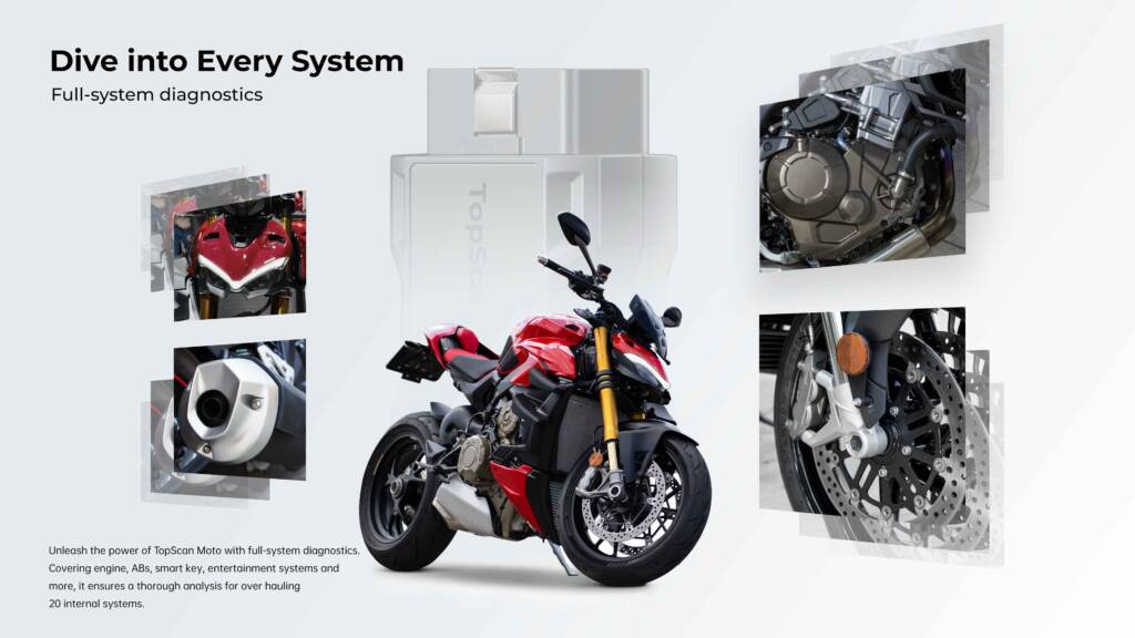 Απελευθερώστε τη δύναμη του TopScan Moto με πλήρους διάγνωσή όλων των συστήματος. Καλύπτοντας τον κινητήρα, το ABS, το έξυπνο κλειδί, τα συστήματα ψυχαγωγίας και πολλά άλλα, εξασφαλίζει μια διεξοδική ανάλυση για την αντιμετώπιση προβλημάτων 20 εσωτερικών συστημάτων.