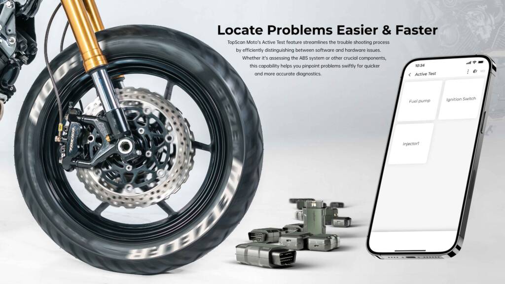 Η λειτουργία Active Test του TopScan Moto βελτιστοποιεί τη διαδικασία αντιμετώπισης προβλημάτων διακρίνοντας αποτελεσματικά μεταξύ προβλημάτων λογισμικού και υλικού. Είτε πρόκειται για την αξιολόγηση του συστήματος ABS είτε για άλλα κρίσιμα εξαρτήματα, αυτή η δυνατότητα σάς βοηθά να εντοπίζετε εύκολα προβλήματα για ταχύτερη και ακριβέστερη διάγνωση.
